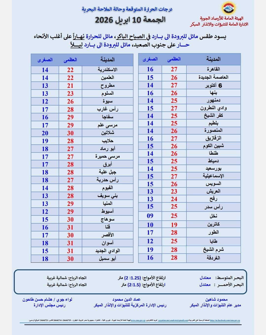 كما توجد فرص ضعيفة لسقوط أمطار خفيفة على مناطق من السواحل الشمالية وشمال الوجه البحري، مع نشاط للرياح على فترات متقطعة ببعض المناطق، خاصة السواحل الشمالية والقاهرة الكبرى.