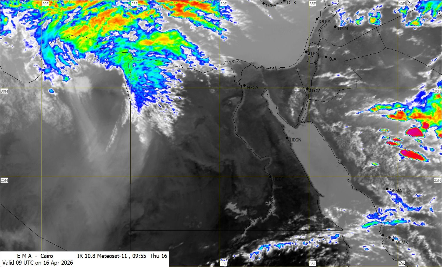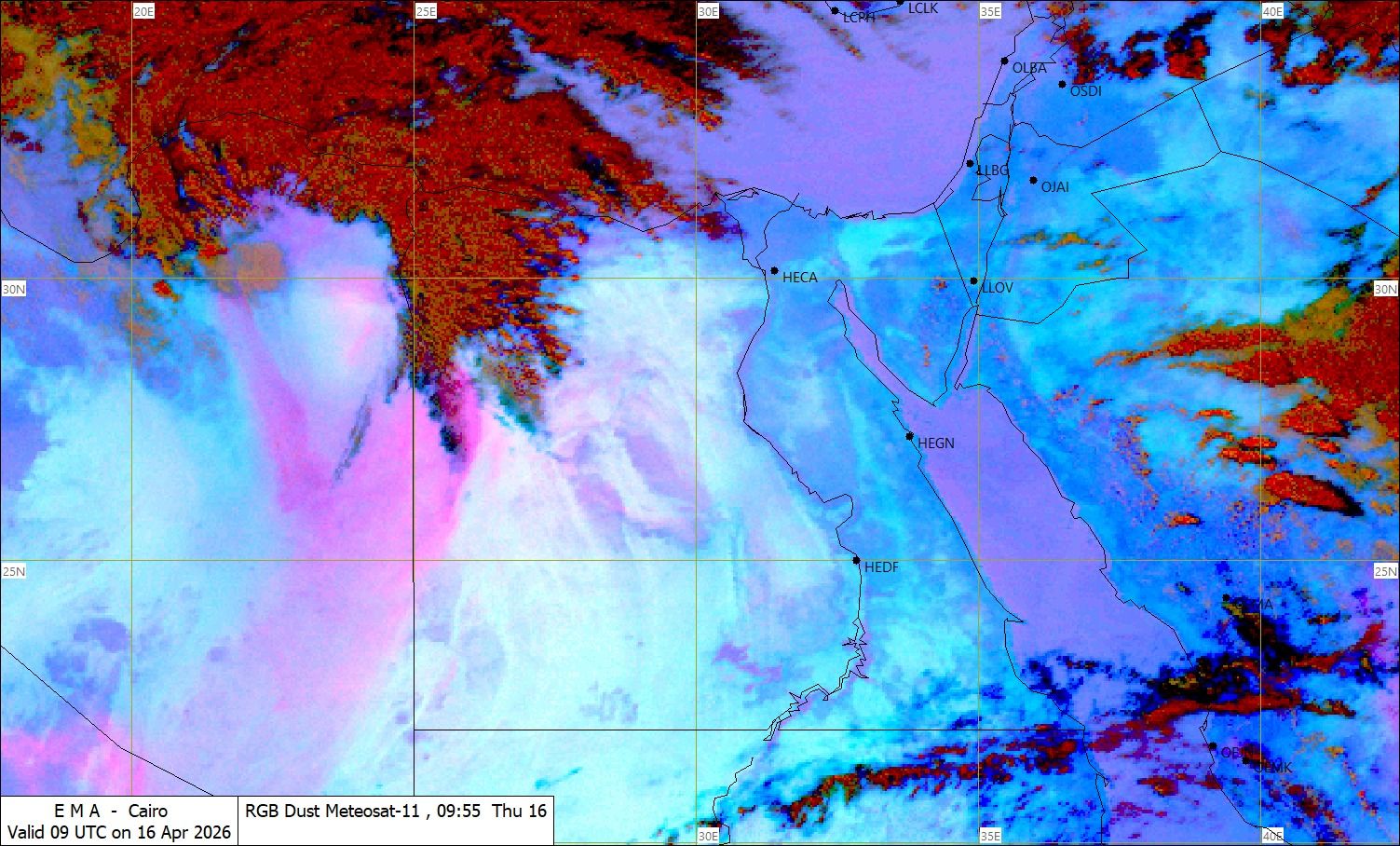 وتشير آخر صور الأقمار الصناعية إلى وجود الأتربة والرمال المثارة أقصى الحدود الغربية، نتيجة تأثير منخفض جوي قادم من ليبيا، مما يؤدي إلى انخفاض مستوى الرؤية الأفقية في تلك المناطق.