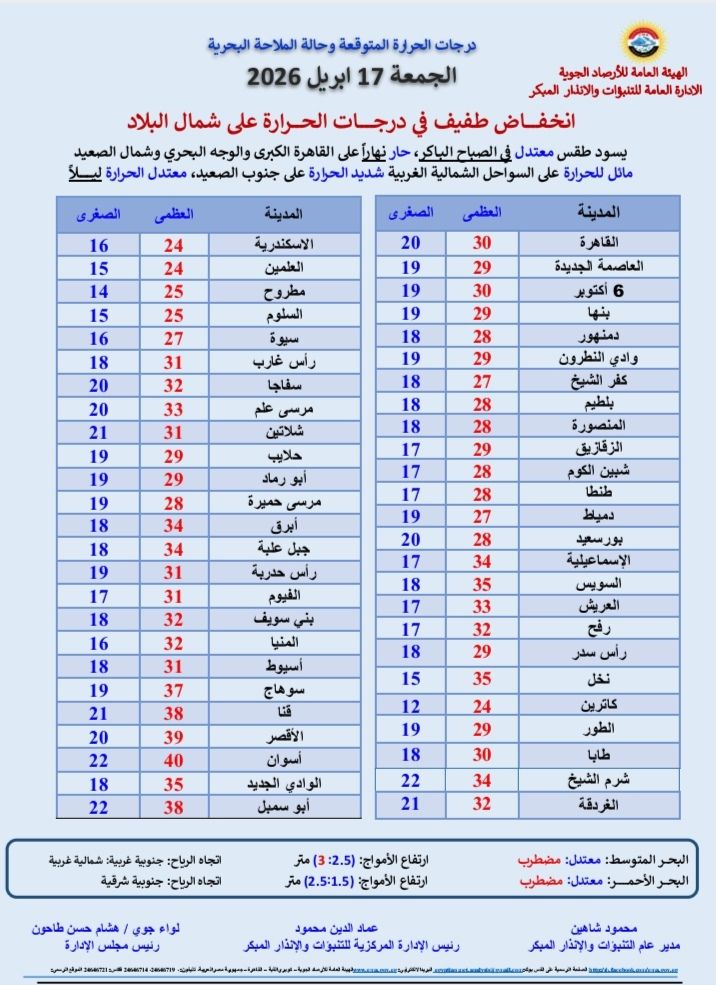 يتوقع خبراء هيئة الأرصاد الجوية أن يسود طقس معتدل في الصباح الباكر، حار نهارا على القاهرة الكبرى والوجه البحري وشمال الصعيد مائل للحرارة على السواحل الشمالية الغربية شديد الحرارة على جنوب الصعيد ، معتدل الحرارة ليلا .