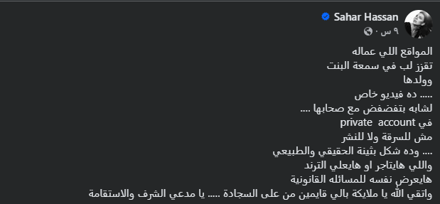 وكتبت سحر حسن عبر حسابها على موقع التواصل الاجتماعي فيسبوك، أن الفيديو المتداول كان منشورًا على حساب خاص ويخص حديثًا شخصيًا بين ابنتها وأصدقائها، مؤكدة أنه تم تداوله خارج سياقه الحقيقي.