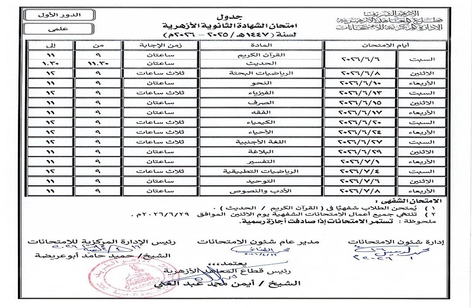 اعتمد الشيخ أيمن عبد الغني، رئيس قطاع المعاهد الأزهرية، اليوم السبت الموافق 18 أبريل 2026، جداول امتحانات الشهادة الثانوية الأزهرية للدور الأول للعام الدراسي 2025/2026، وذلك بعد إعدادها من قبل الإدارة المركزية للامتحانات برئاسة الشيخ حميد حامد أبو عريضة.