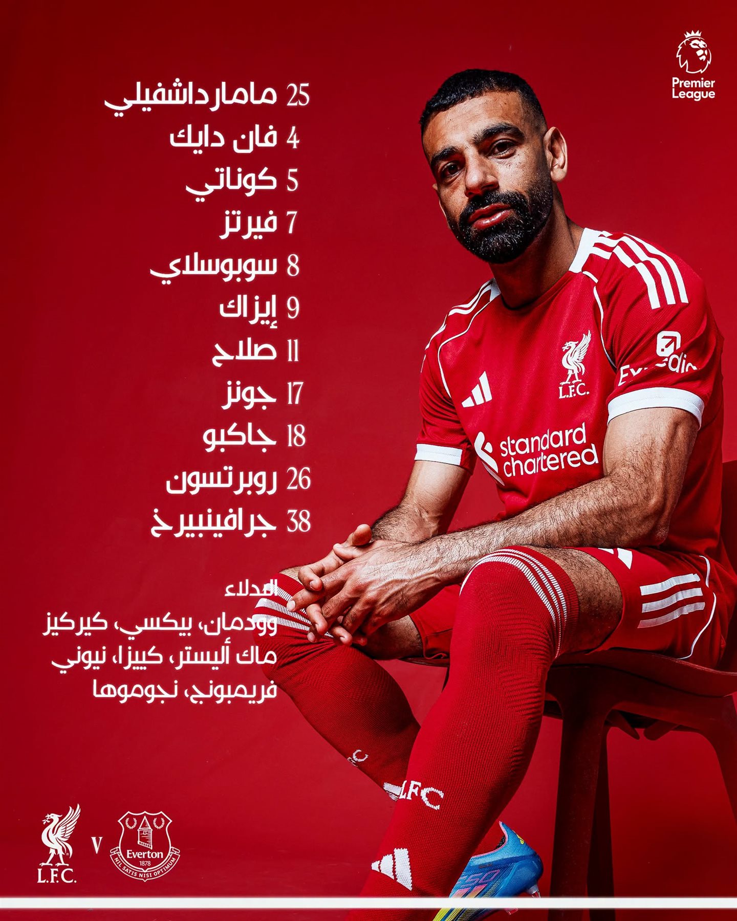 أعلن آرني سلوت المدير الفني لنادي ليفربول المحترف ضمن صفوفه محمد صلاح قائد منتخب مصر، التشكيلة الأساسية التي سيخوض على أثرها مباراة إيفرتون التي تنطلق في الثالثة عصر اليوم بملعب «هيل ديكنسون ستاديوم» ضمن منافسات الجولة الـ33 من عمر مسابقة الدوري الإنجليزي الممتاز، في ديربي يحمل طابعًا تنافسيًا خاصًا.