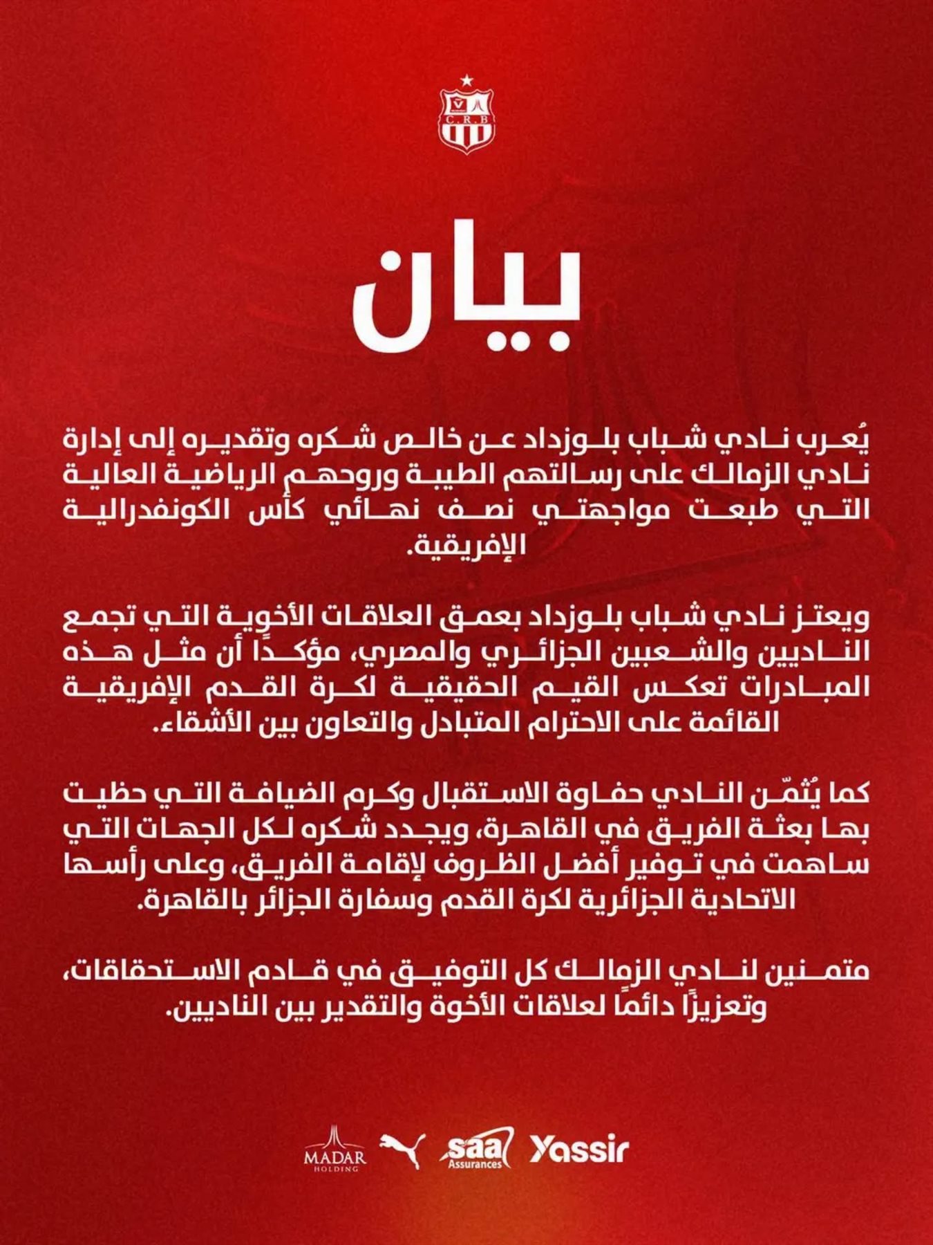 أعرب نادي شباب بلوزداد الجزائري عن خالص شكره وتقديره إلى إدارة نادي الزمالك على رسالتهم الطيبة وروحهم الرياضية العالية التي طبعت مواجهتي نصف نهائي كأس الكونفدرالية الإفريقية.