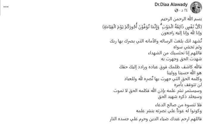 الصفحة الرسمية للدكتور ضياء العوضي تعلن وفاته