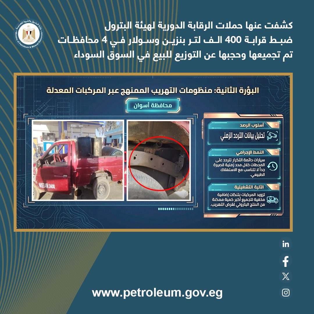 وقد أسفرت الحملات عن ضبط 396 ألف لتر من السولار والبنزين جرى التلاعب فيها بالمخالفة للقانون، بقيمة تقارب 16 مليون جنيه، في وقائع تمثل أعباءً على الدولة في ظل الأوضاع الراهنة بالشرق الأوسط وارتفاع أسعار الطاقة وتكلفة الاستيراد، وقد جري اتخاذ الإجراءات القانونية لتحصيلها كغرامات من المخالفين.