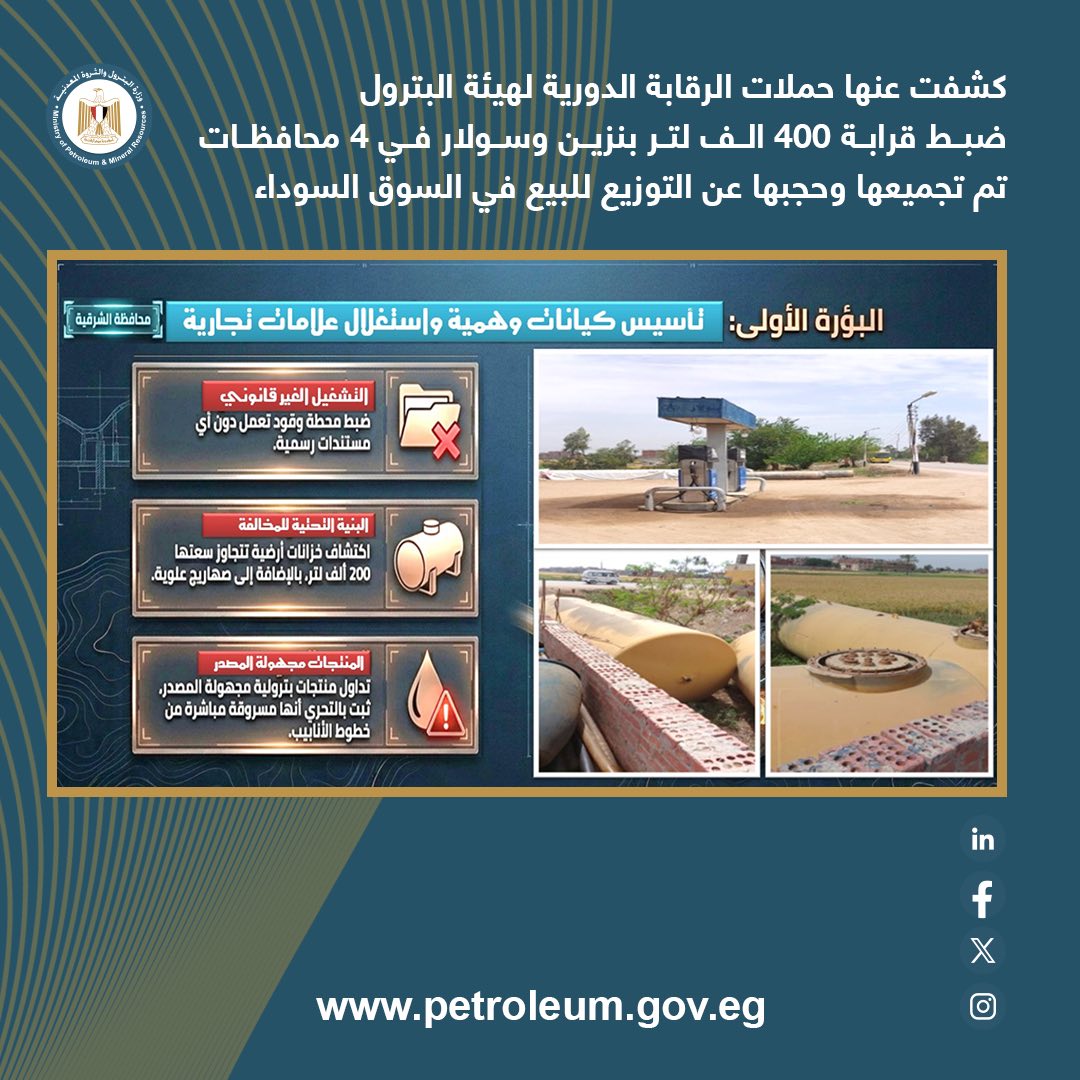 وتم ضبط محطة غير مرخصة بالشرقية تضم خزانات أرضية تتجاوز 200 ألف لتر وصهاريج علوية، وتبين من التحريات استخدامها في تداول منتجات مجهولة المصدر ومسروقة من خطوط الأنابيب.