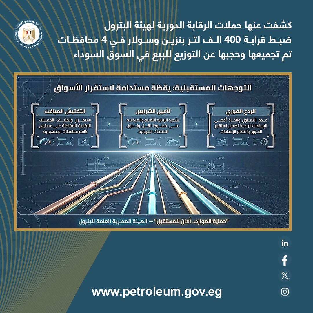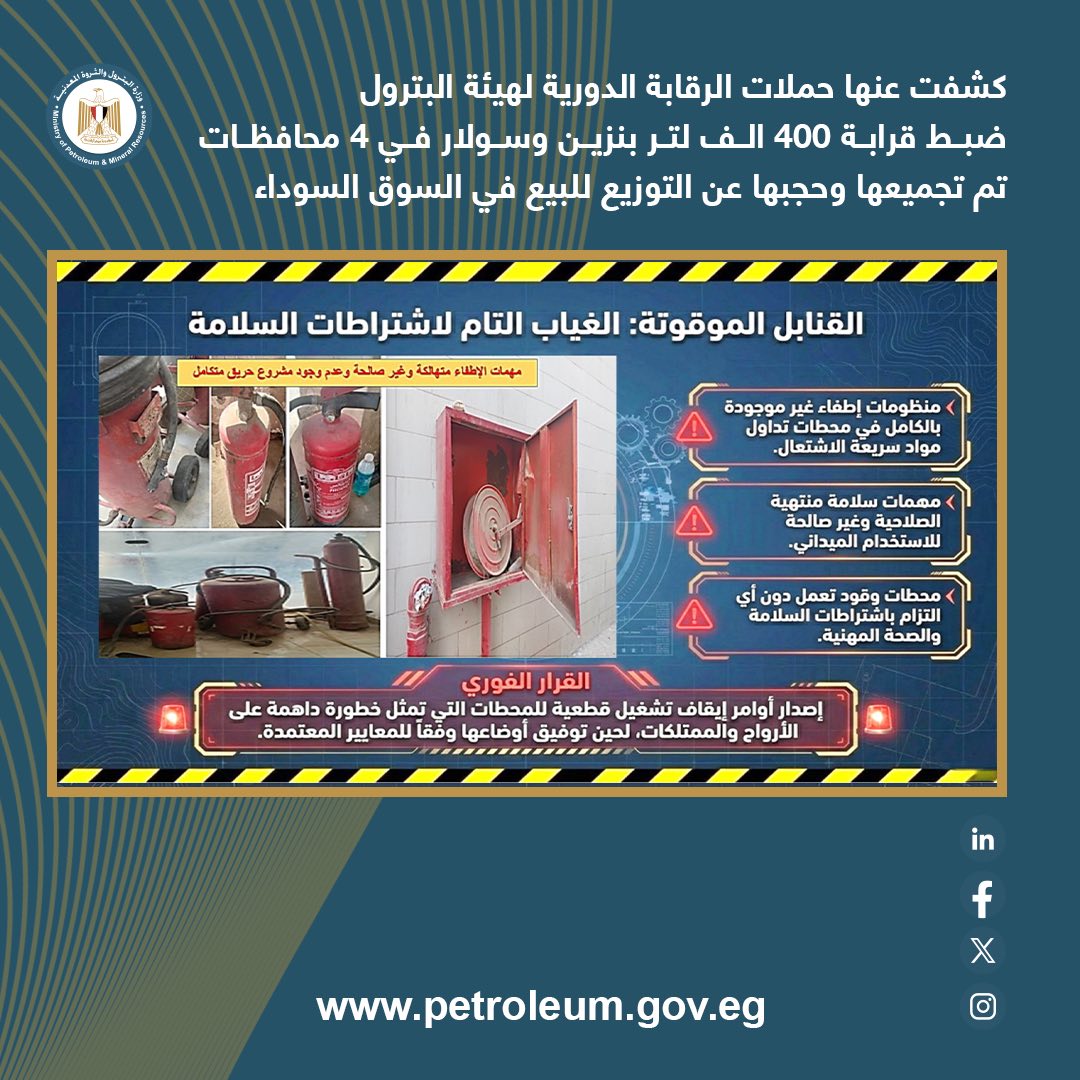 وأكدت الهيئة على الاستمرار في تكثيف الحملات الرقابية المفاجئة على مستوى الجمهورية وتشديد إجراءات الرقابة على خطوط نقل وتداول المنتجات البترولية واتخاذ إجراءات رادعة وفورية تجاه المخالفين لضمان عدم تكرار المخالفات .