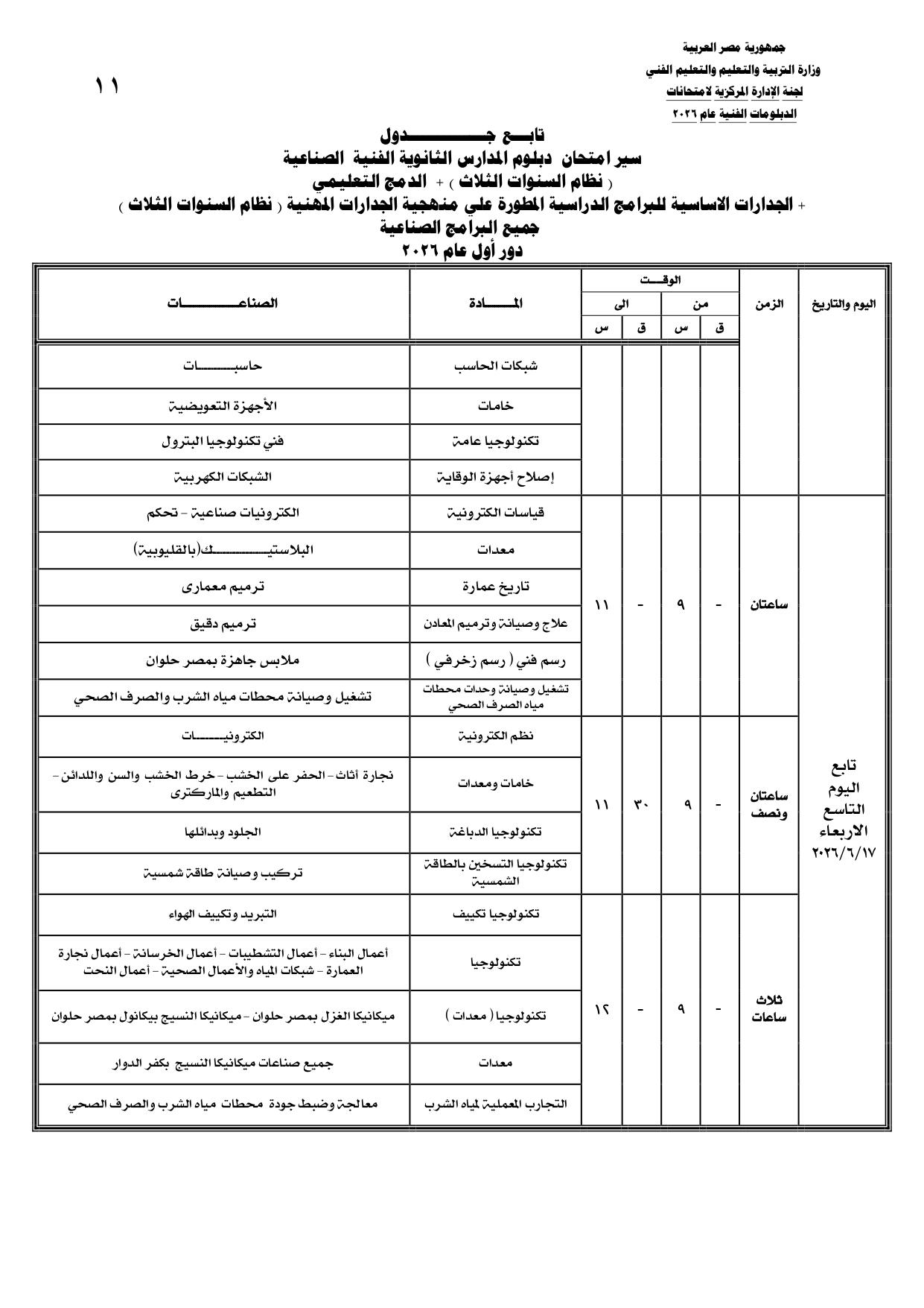 اعتمد محمد عبد اللطيف وزير التربية والتعليم والتعليم الفني، جداول امتحانات الدبلومات الفنية نظام (5 سنوات، 3 سنوات) بكافة نوعياتها (صناعي - زراعي - تجاري - فندقي) ودبلوم مدارس التكنولوجيا التطبيقية، وكذلك الإعداد المهني والتعليم والتدريب المزدوج، وكذا جدول امتحانات الدبلومات الفنية نظام الثلاث سنوات المطبق بها منهجية الجدارات المهنية، بالإضافة إلى الجداول الخاصة بطلبة الدمج بكل نوعية.
