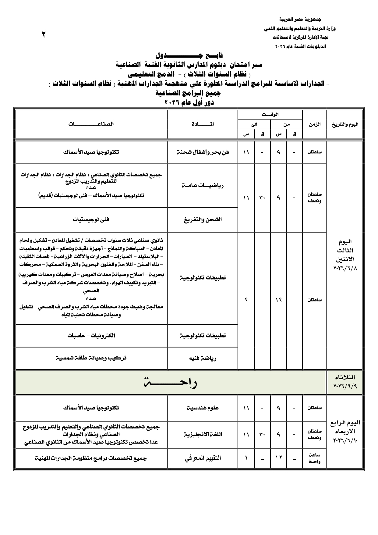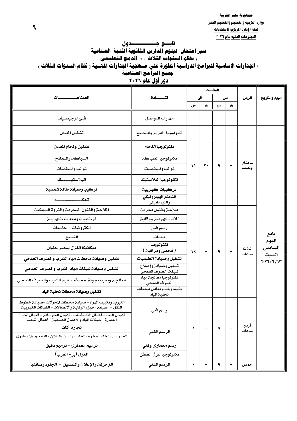 ومن المقرر أن تنطلق بداية امتحانات الدبلومات الفنية يوم السبت الموافق 6 يونيو 2026، وفقا للجداول المعلنة.