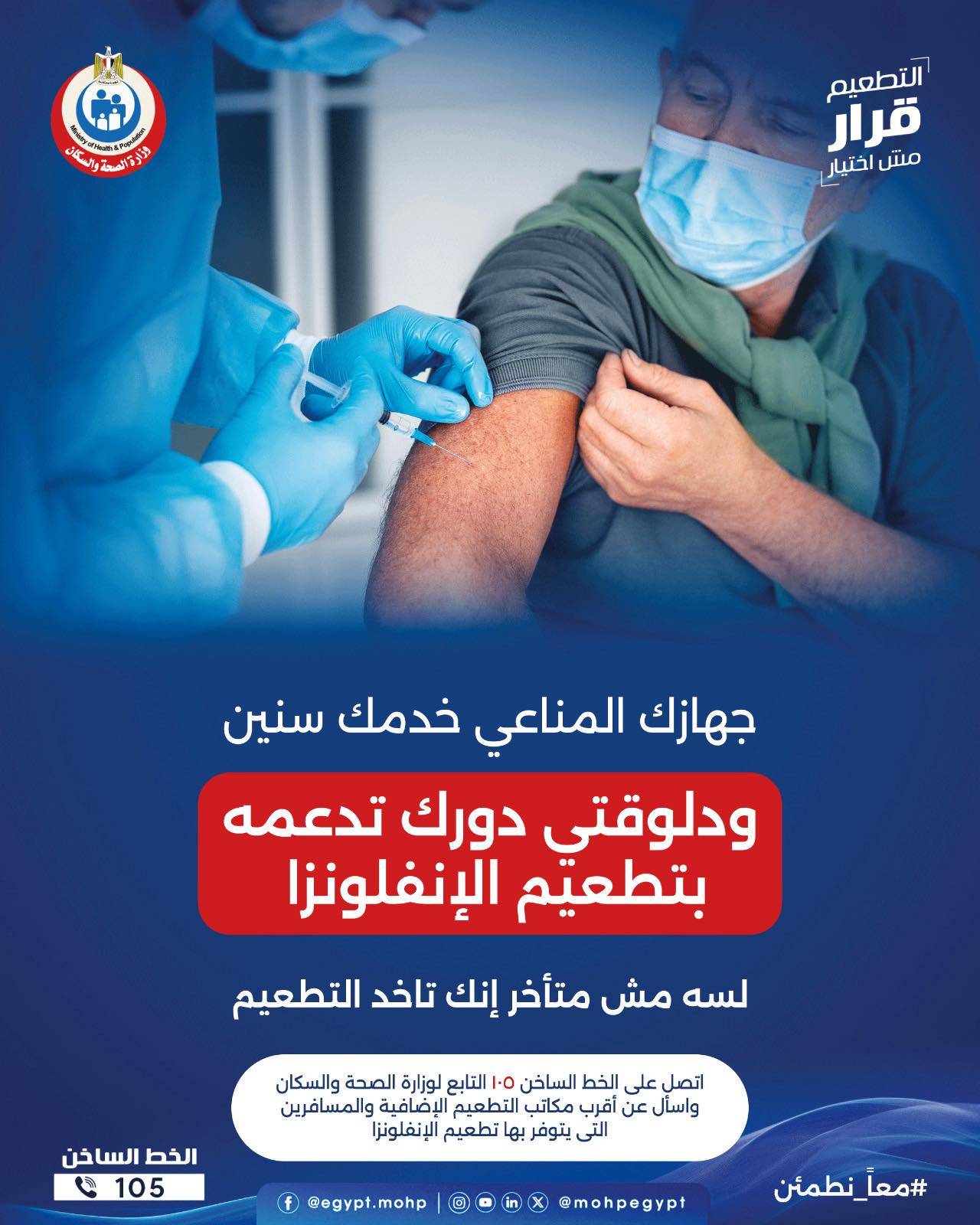 شددت وزارة الصحة والسكان، على ضرورة حصول الحجاج على تطعيم الإنفلونزا قبل السفر إلى المملكة العربية السعودية، باعتباره خطوة مهمة تحمي من العدوى وسط الزحام، أثناء أداء شعائر الحج في الأراضي المقدسة.