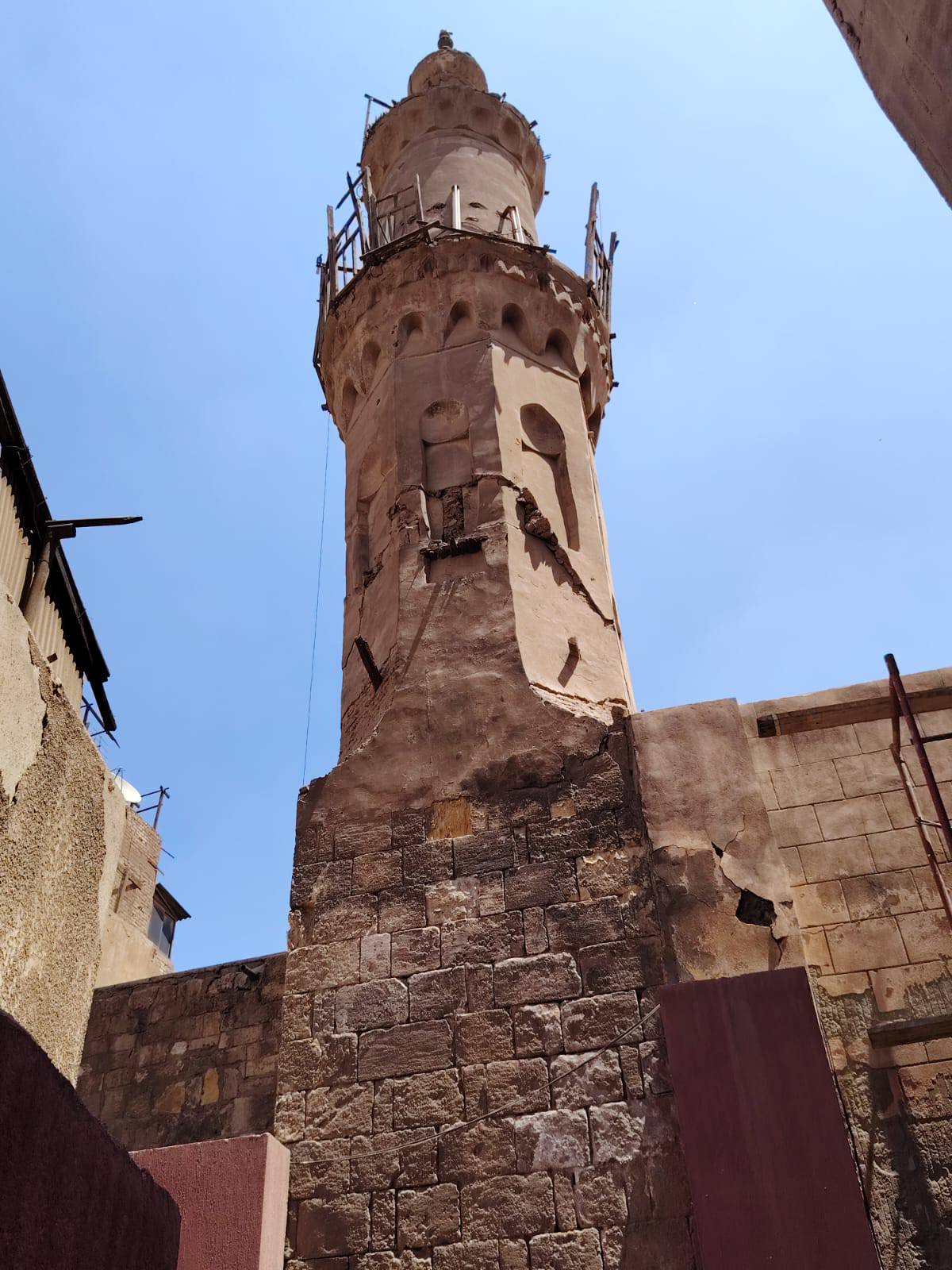 وخلال المعاينة، تبيّن وجود خطورة إنشائية جسيمة بالمئذنة، تمثلت في شروخ وانفصالات وانهيار جزئي بجوسق المئذنة، فضلاً عن وجود ميل واضح وانفصالات بكرسي المئذنة، بما يشكل خطرًا داهمًا على المواطنين والطلاب بالمناطق المحيطة.