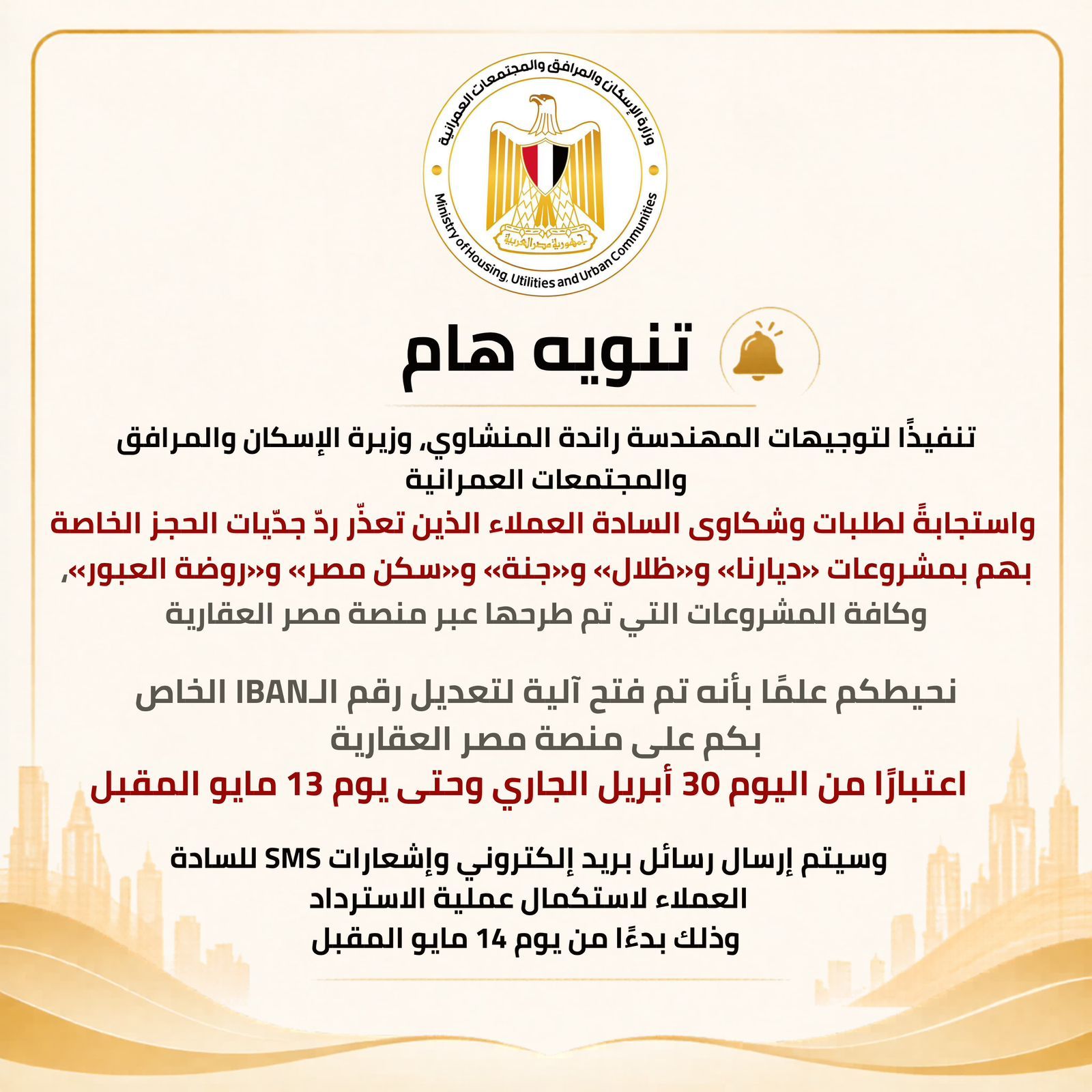 وأشارت الوزارة إلى أنه تمت إتاحة إمكانية تعديل رقم الـ IBAN من خلال منصة مصر العقارية، اعتبارًا من اليوم 30 أبريل 2026، وحتى يوم 13 مايو المقبل.