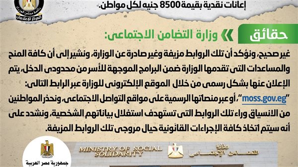 «الحكومة» تنفي صرف «التضامن» إعانات نقدية للمواطنين بقيمة 8500 جنيه