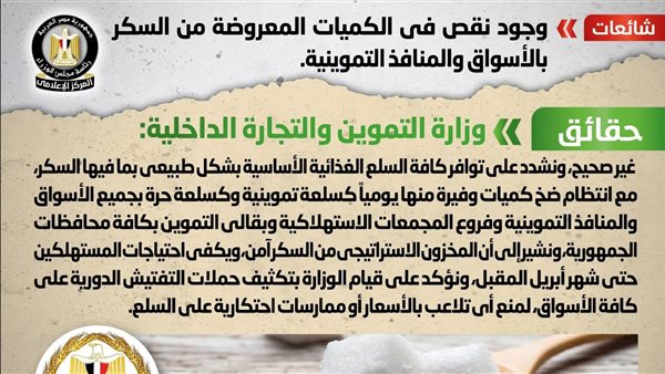 الحكومة تنفي وجود نقص في الكميات المعروضة من السكر بالأسواق والمنافذ التموينية