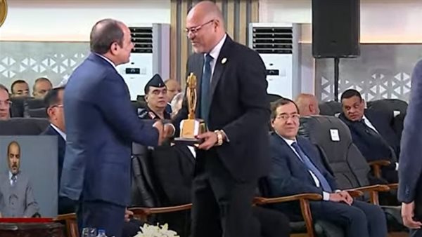 رئيس اتحاد العمال يهدي الرئيس السيسي درعا تذكاريا خلال احتفالية عيد العمال