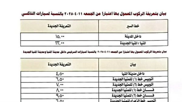 المنيا تعتمد التعريفة الجديدة لنقل الركاب بعد تحريك أسعار المنتجات البترولية