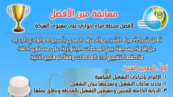 «مياه أسيوط» تطلق مسابقه لاختيار الأفضل بين المحطات الارتوازية