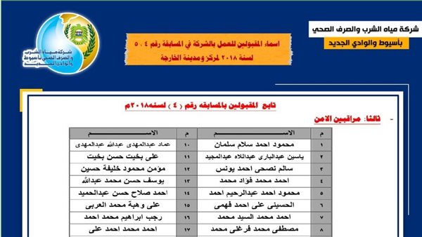 «مياه أسيوط» تعلن أسماء المقبولين في المسابقة رقم (4-5) لعام 2018 لمركز ومدينة الخارجة
