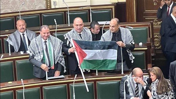 أعضاء «النواب» يرتدون الكوفية الفلسطينية ويحملون أعلام فلسطين خلال الجلسة الطارئة.. صور