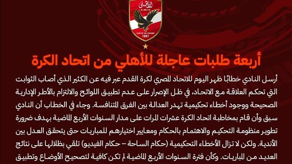 أربعة طلبات عاجلة للأهلي من اتحاد الكرة