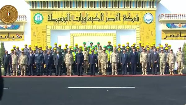 الرئيس السيسي يتوسط صورة تذكارية مع العاملين بمجمع الصناعات الكيماوية في «أبو رواش»