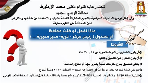 الوادي الجديد تطلق مسابقة شبابية «لوكنت محافظ أو مسئول» لتطوير الأداء الخدمي