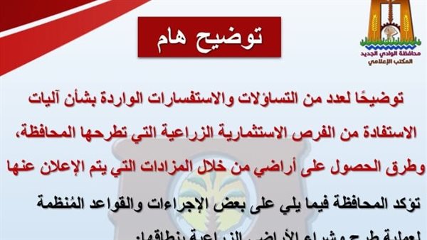 آليات الاستفادة من الفرص الاستثمارية الزراعية التي تطرحها الوادي الجديد للبيع
