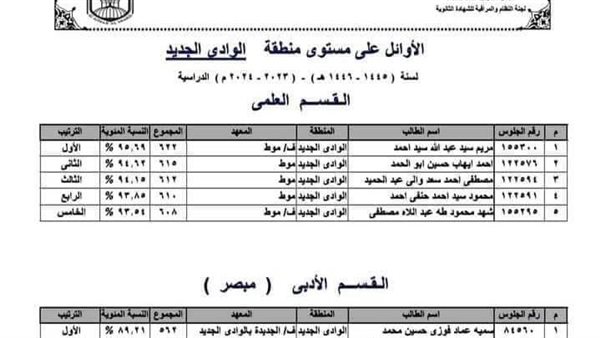 أسماء العشرة أوائل الثانوية الأزهرية بالوادي الجديد