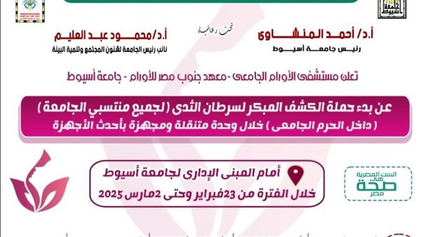 جامعة أسيوط تُطلق حملة للكشف المبكر عن سرطان الثدي لجميع منتسبات الجامعة الأحد المقبل
