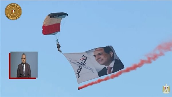 قوات المظلات تقدمًا عرضًا جويًا ويحملون أعلام مصر وصورة الرئيس السيسي