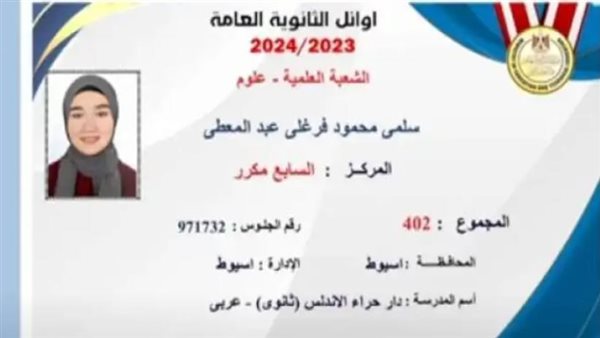 سلمى محمود الحاصلة على المركز السابع مكرر علمي: ثقتي بالله واسرتي كانا دافعا لي في التفوق
