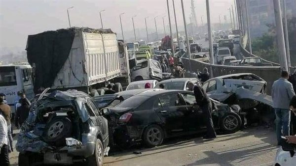 تصادم تريلا و7 سيارات ملاكي ونقل على الدائري