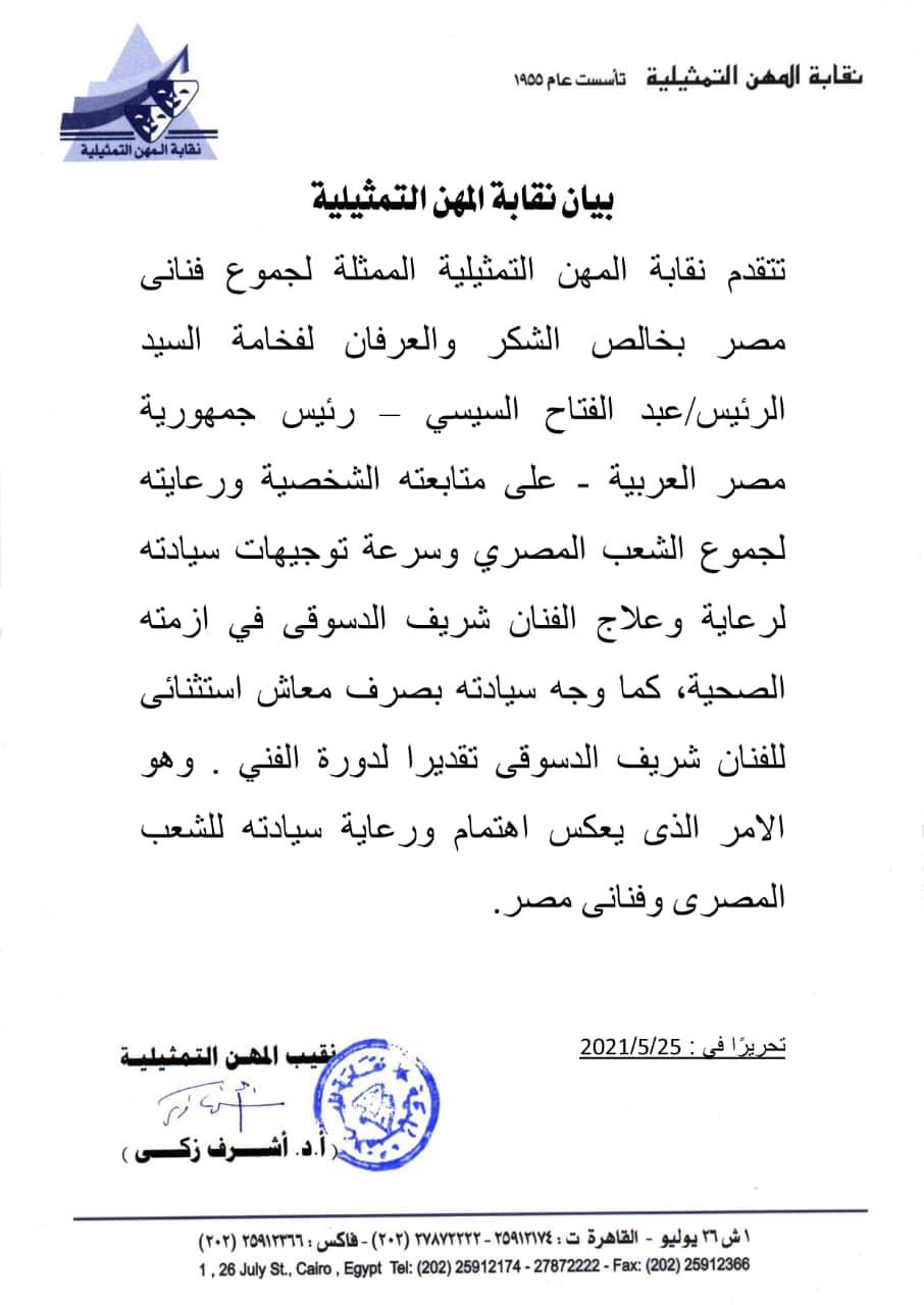 أعلنت نقابة المهن التمثيلية؛ برئاسة الفنان أشرف زكي، عن شكرها للرئيس عبدالفتاح السيسي، على وقوفه بجانب أزمة الفنان شريف دسوقي.