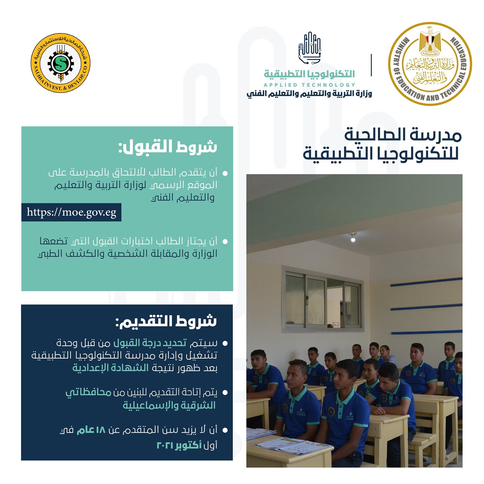 أعلنت وزارة التربية والتعليم والتعليم الفني، لجميع طلاب الشهادة الإعدادية، كل ما يخص مدرسة الصالحية للتكنولوجيا التطبيقية بمختلف تخصصاتها الفنية والهندسية.