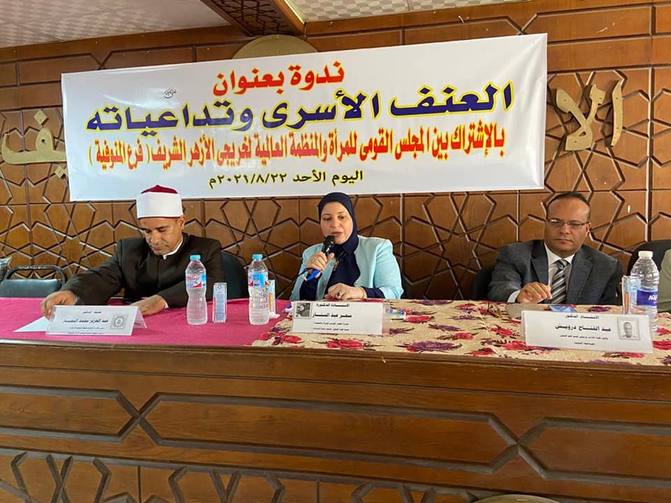 جاء ذلك خلال ندوة عقدتها المنظمة العالمية لخريجي الأزهر بفرع المنوفية، اليوم ضمن سلسلة ندوات تتناول "العنف الأسري وتداعياته" بالتعاون مع المجلس القومي للمرأة لمواجهة الظواهر التي انتشرت في الآونة الأخيرة التي تهدد السلم والأمن المجتمعي.