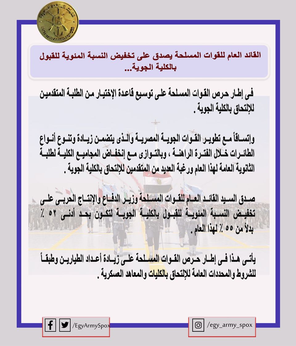 صدق الفريق أول محمد زكي، القائـد العـام للقـوات المسلحـة وزيـر الدفـاع والإنتـاج الحربـي على تخفيض النسبة المئوية للقبول بالكلية الجوية لتكون بحد أدنى 52 % بدلا من 55%.