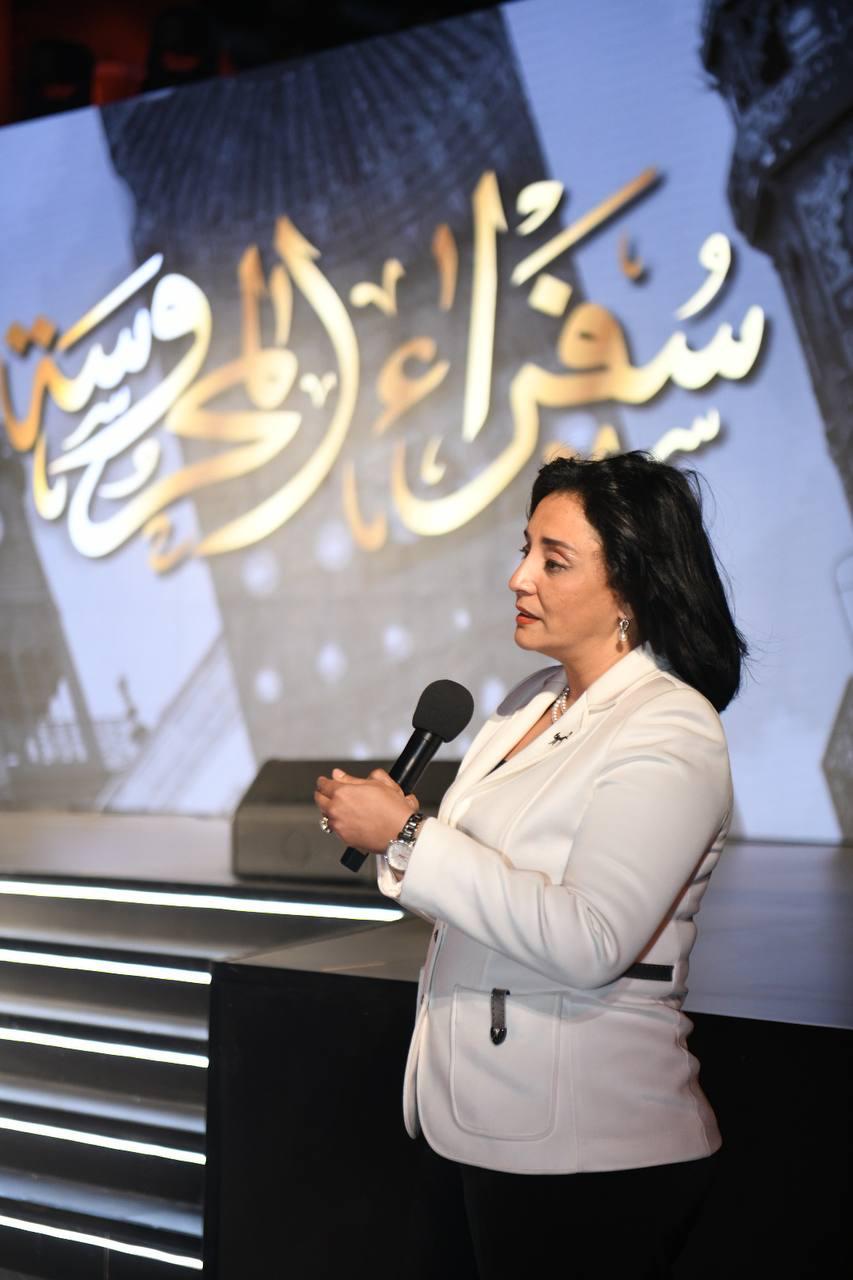وتحدث أيضاً عن آخر الاكتشافات الأثرية، وافتتاحات متاحف شرم الشيخ وكفر الشيخ والمركبات الملكية وسوهاج والمطار وغيرها، إلى جانب الافتتاحات الأخرى مثل المعبد اليهودي وقصر البارون، مستعرضاً المشاريع الأثرية التي يتم العمل بها حالياً مثل ترميم قصر محمد علي شبرا وغيره.