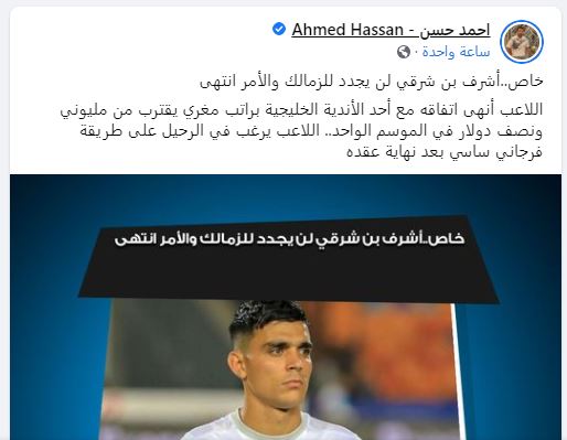 وكتب أحمد حسن - عبر حسابه الرسمي على موقع التواصل الاجتماعي "فيسبوك" -: "اللاعب أنهى اتفاقه مع أحد الأندية الخليجية، براتب مغري يقترب من مليوني ونصف دولار في الموسم الواحد.. اللاعب يرغب في الرحيل على طريقة فرجاني ساسي بعد نهاية عقده".