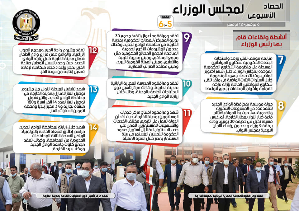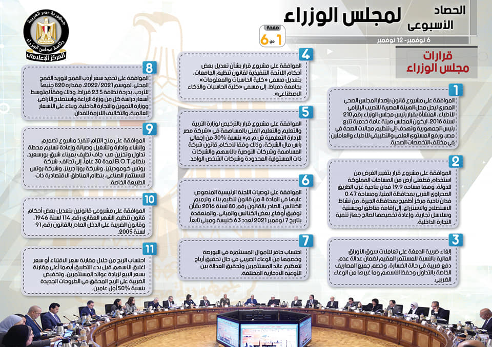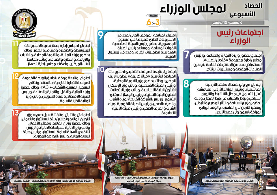نشر المركز الإعلامي لمجلس الوزراء، تقريراً شمل إنفوجرافات سلط من خلالها الضوء على الحصاد الأسبوعي لمجلس الوزراء، وذلك خلال الفترة من 6 حتى 12 نوفمبر 2021، والذي تضمن الموافقة على عدد من القرارات، فضلاً عن الاجتماعات واللقاءات التي عقدها الدكتور مصطفى مدبولي، رئيس مجلس الوزراء، بالإضافة إلى ما قام به سيادته من أنشطة.