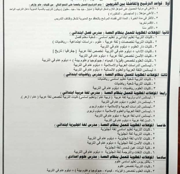 خريج مؤهل عال + دبلوم تربوي، ويكون من المؤهلات التي ينطبق عليها العمل بكل تخصص لافتا إلى أنه على المتقدم تقديم الأوراق الأتية: