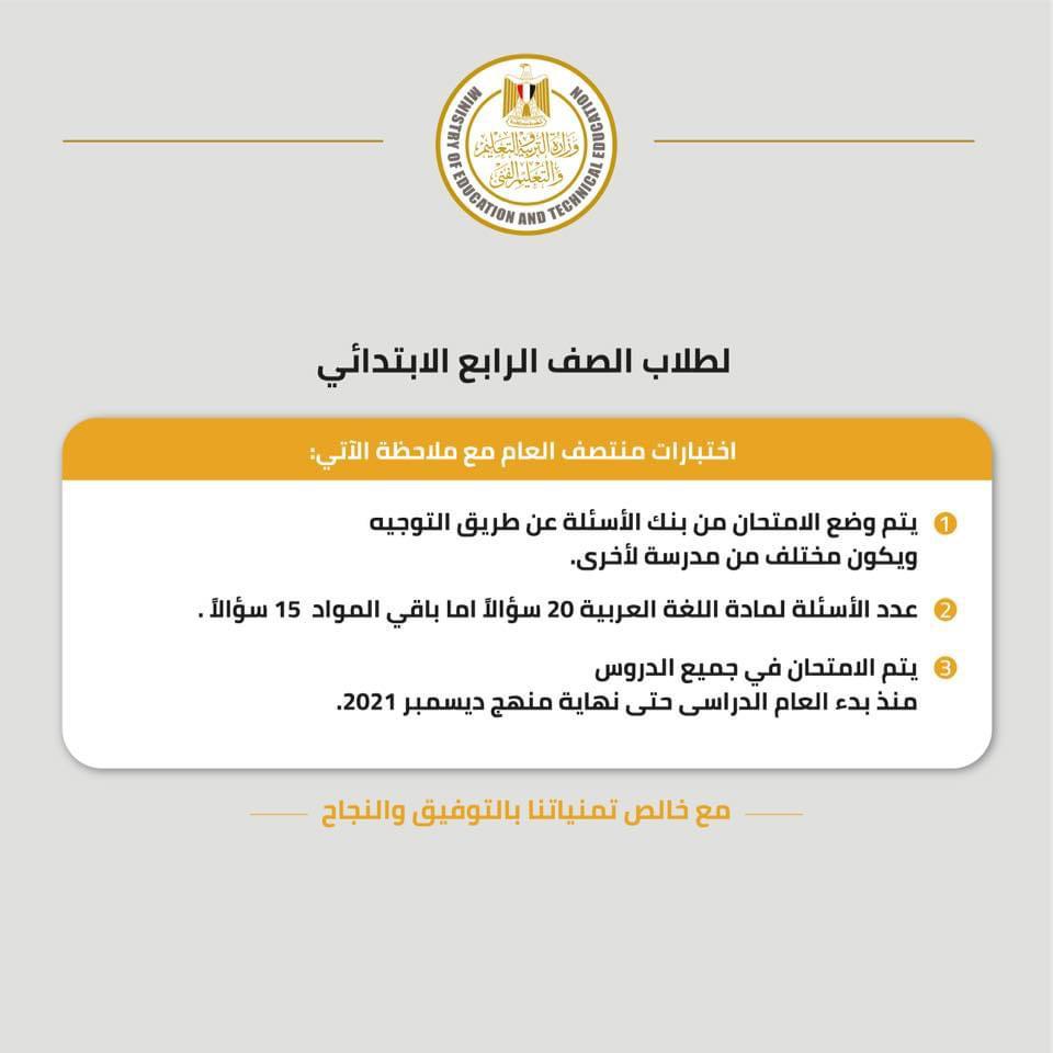 «التعليم» تعلن جدول امتحانات منتصف العام لطلاب الصف الرابع الابتدائي