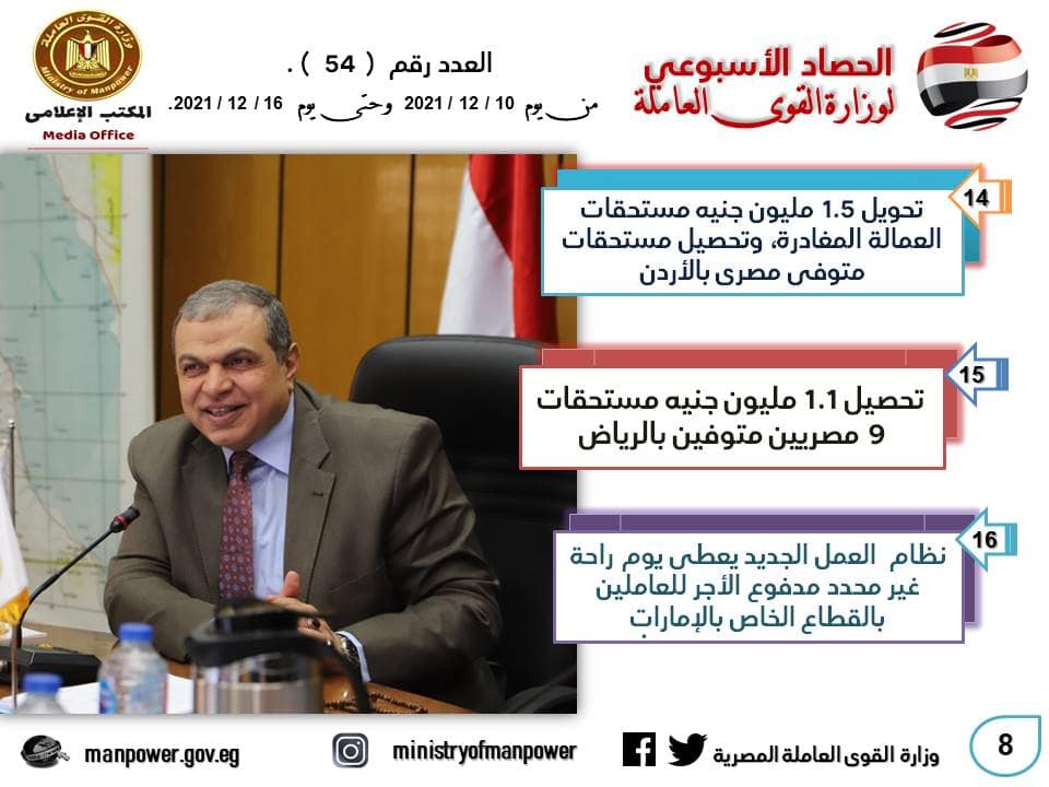 وامتد الحصاد ليشمل ، نجاح مكتب التمثيل العمالي التابع للوزارة بالسفارة المصرية بعمان-الأردن، بالمتابعة اللحظية والجهود المبذولة والمقابلات مع المسئولين بمؤسسة الضمان الاجتماعي بالأردن، واستكمالا لما تم تحويله سابقا، تم تحويل القائمة الـ 60 من مستحقات الضمان الاجتماعي لنحو 49 عامل مصري لدى المؤسسة غادروا عمان نهائيا.