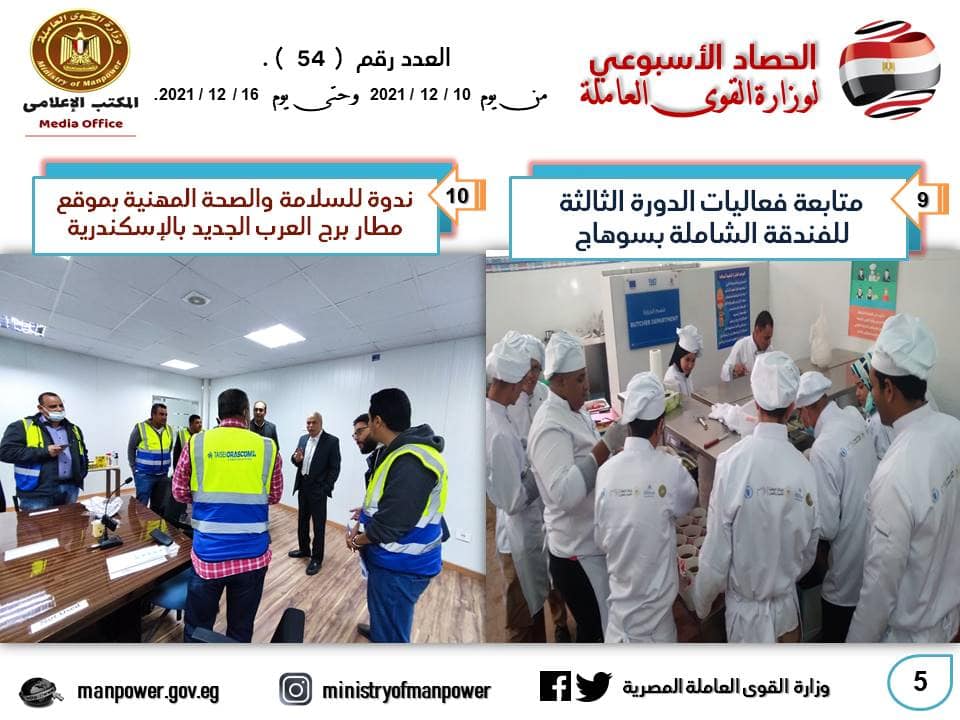كما يتابع وزير القوي العاملة، سير عملية التدريب بمراكز التدريب المهني بالمحافظات، في إطار مبادرة "حياة كريمة" التي أطلقها الرئيس عبدالفتاح السيسي، لافتا إلى أن ذلك ضمن مبادرة "مهارتك أساس مهنتك" لتأهيل الشباب والتدريب الفندقي لمدة ستة أسابيع منها أربعة بمركز الكوثر التابع لمديرية القوي العاملة بسوهاج، وأسبوعين بهيلتون الأقصر، بالتعاون مع برنامج الأغذية العالمية ومنتجع وسبا هيلتون الأقصر، ما يسهم في تشغيل الشباب وخفض معدلات البطالة.