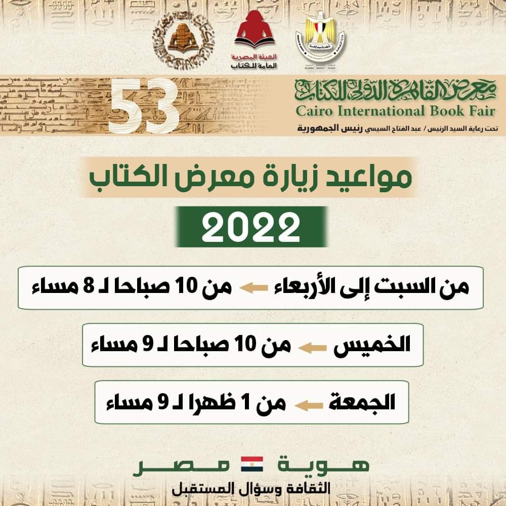 ومن المقرر أن يستقبل معرض الكتاب، جمهوره وعشاق القراءة، ابتداء من يوم الخميس الموافق 27 يناير حتى يوم الختام 7 فبراير بالمواعيد التالية: