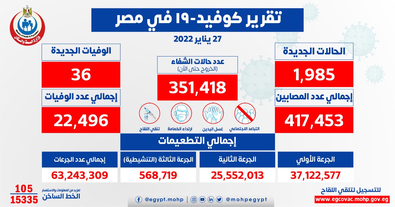وأوضح الدكتور حسام عبدالغفار المتحدث الرسمي لوزارة الصحة والسكان، أنه تم تسجيل 1985 حالة جديدة ثبتت إيجابية تحاليلها للفيروس ومتحوراته، وذلك ضمن إجراءات الترصد والتقصي والفحوصات اللازمة التي تُجريها الوزارة وفقًا لإرشادات منظمة الصحة العالمية، لافتًا إلى وفاة 36 حالة جديدة.