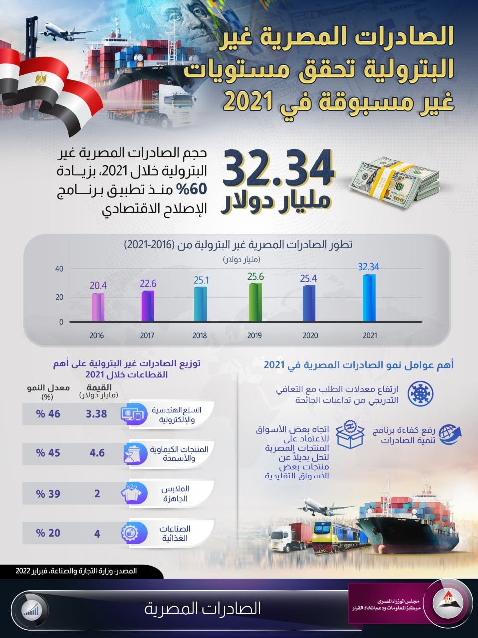 ونشر مركز معلومات مجلس الوزراء إنفوجرافا يوضح خريطة الصادرات المصرية خلال 2021، حيث جاء حجم الزيادة مدفوعًا بالارتفاع في حجم الصادرات غير البترولية التي وصلت إلى 32.34 مليار دولار مسجلة نموًّا وصل إلى 30% وذلك مقارنة بعام 2020، والصادرات البترولية التي وصلت إلى 12.9 مليار دولار مسجلة معدل نمو بلغ 90% مقارنة بعام 2020.