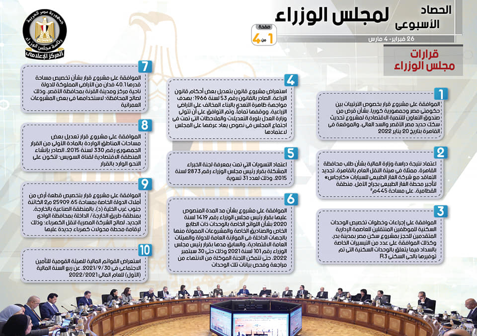 وجاء في التقرير أنه تم إصدار عدد من القرارات، تشمل قرارًا بالموافقة على مشروع قرار بخصوص الترتيبات بين حكومتي مصر وجمهورية كوريا، بشأن قرض من صندوق التعاون للتنمية الاقتصادية لمشروع تحديث سكك حديد مصر الأقصر والسد العالي، والموقعة في القاهرة بتاريخ 20 يناير الماضي، بالإضافة إلى قرار باعتماد نتيجة دراسة وزارة المالية بشأن طلب محافظة القاهرة، ممثلة في هيئة النقل العام بالقاهرة، تجديد التعاقد مع شركة الغاز الطبيعي للسيارات "كارجاس" لتأجير محطة الغاز الطبيعي بجراج الأمل، منطقة القطامية، على مساحة 445م2.