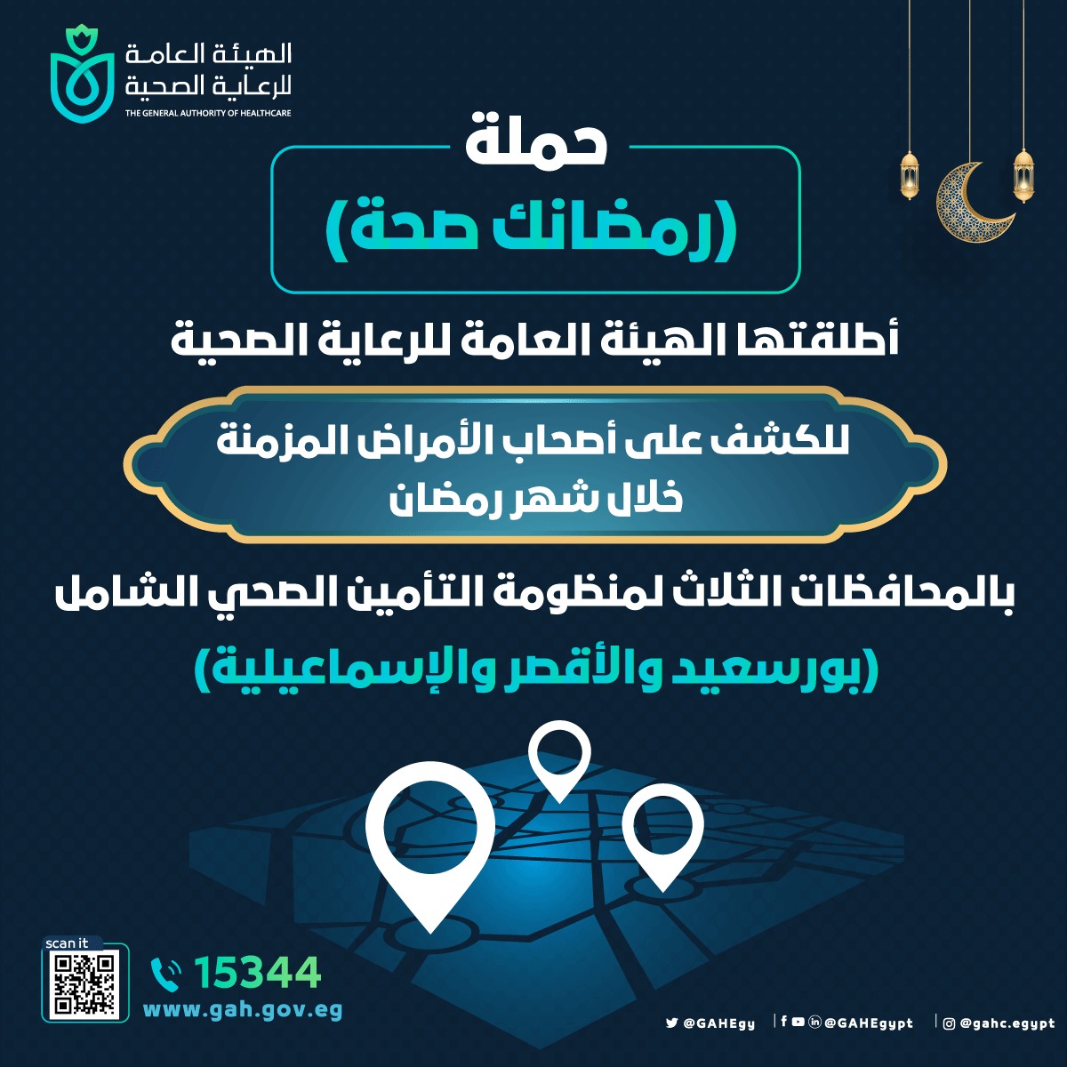 وأشار البيان، إلى الأهداف السبعة لمبادرة هيئة الرعاية الصحية "رمضانك صحة" بالمحافظات الثلاث لمنظومة التأمين الصحي الشامل، والتي تبدأ بالكشف على أصحاب الأمراض المزمنة من مرضى السكر والضغط في منازلهم، والتوعية والتثقيف الصحي بأنماط التغذية الصحية السليمة لأصحاب الأمراض المزمنة، وقياس العلامات الحيوية للمرضى من مستوى ضغط ونسبة السكر العشوائي ومعدل النبض في منازلهم، مروًا بتوجيه المرضى لوحدات طب الأسرة حال الاحتياج لإجراء الفحوصات ذات المستوى الأعلى أو زيارة طبيب الأسرة، أو إحالة المريض لإخصائي بأحد مراكز طب الأسرة أو المستشفى حال الاحتياج لذلك، وصولًا لصرف العلاج لأصحاب الأمراض المزمنة، والتوعية الصحية والتأكيد على الالتزام بمواعيد تناول الأدوية للمرضى وذويهم.