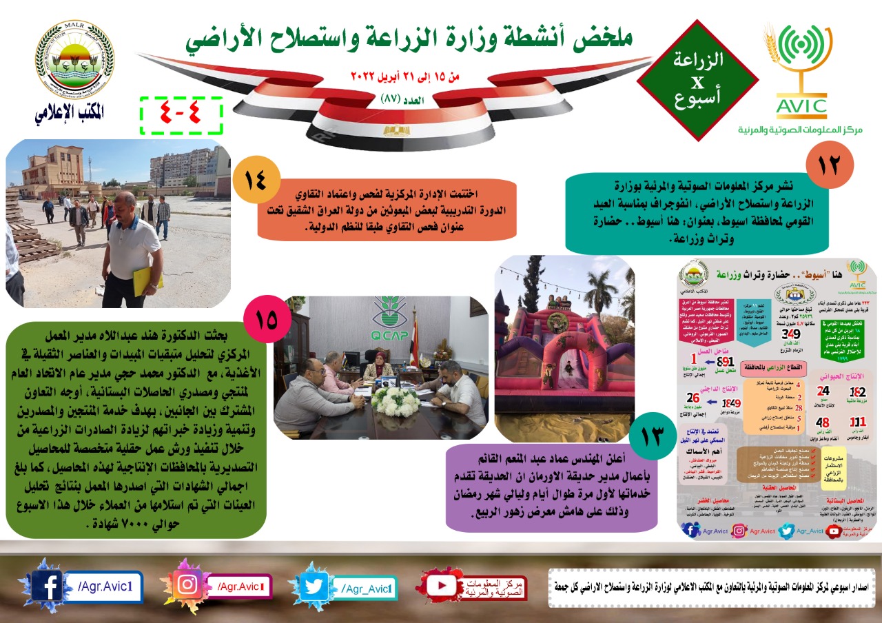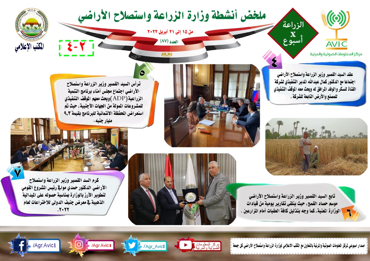 أصدر مركز المعلومات الصوتية والمرئية، التابع لوزارة الزراعة واستصلاح الأراضي، "الانفوجراف الأسبوعي" في نسخته رقم 87، حول الحصاد الأسبوعي لأهم أنشطة الوزارة، خلال الأسبوع الماضي في الفترة من 15 إلى 21 أبريل الجاري، وذلك بالتعاون مع المكتب الإعلامي للوزارة.