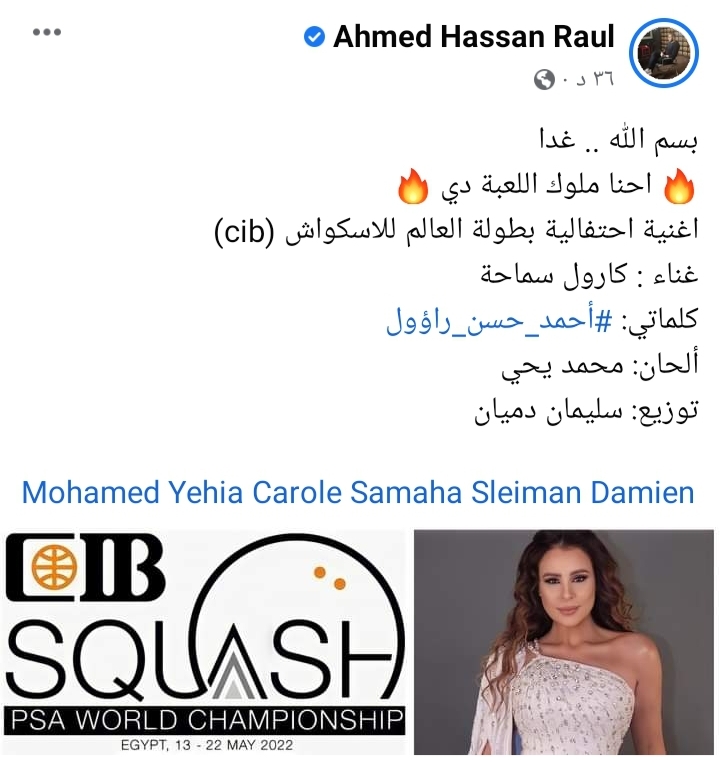 وكتب "راؤول": "بسم الله .. غدا، احنا ملوك اللعبة دي، أغنية احتفالية بطولة العالم للإسكواش (cib) غناء : كارول سماحة، كلماتي: أحمد حسن، راؤول، ألحان: محمد يحيتوزيع: سليمان دميان".